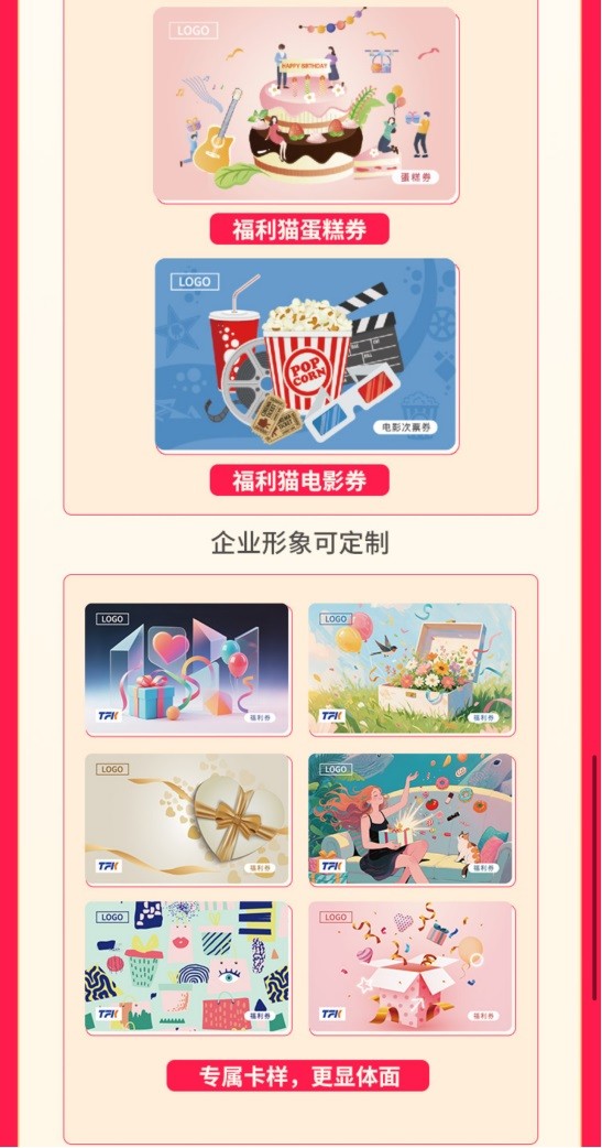 “魯商福利貓”平臺(tái)的核心優(yōu)勢在于其高度的定制化服務(wù)。企業(yè)可以根據(jù)自身需求,定制福利實(shí)體卡券的圖案,讓卡券獨(dú)具特色,展現(xiàn)企業(yè)文化和關(guān)懷。平臺(tái)還支持定制福利卡券類型,涵蓋提貨券、蛋糕券、電影券等多種類型,滿足員工在不同場景下的消費(fèi)需求。此外,福利卡金額也可根據(jù)企業(yè)預(yù)算進(jìn)行靈活定制,實(shí)現(xiàn)精準(zhǔn)福利分配。