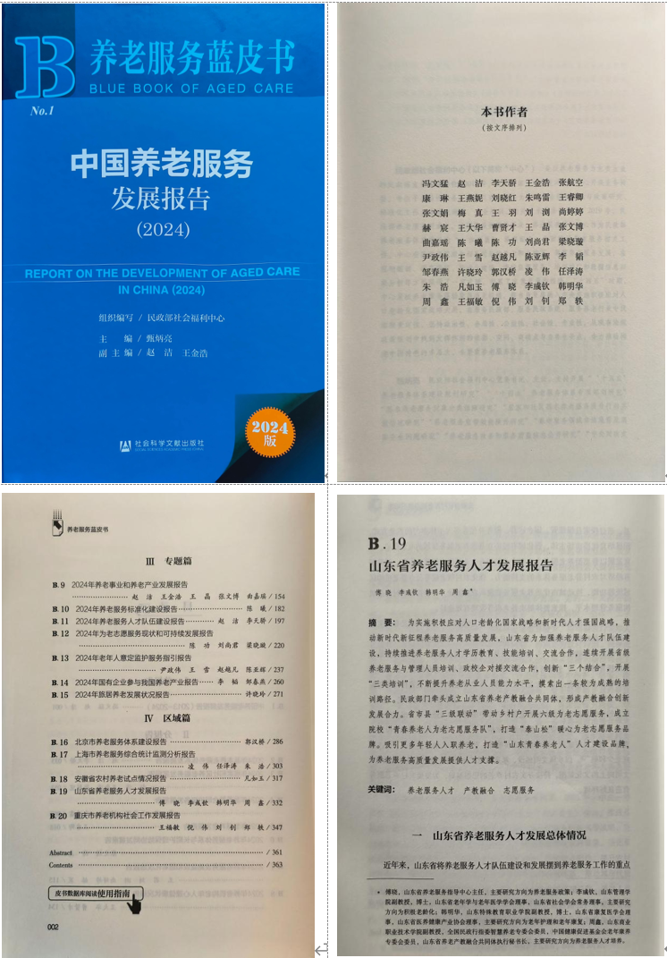 近日,由民政部社會(huì)福利中心組織編撰的《中國養(yǎng)老服務(wù)發(fā)展報(bào)告(2024)》藍(lán)皮書(以下簡稱《藍(lán)皮書》)正式發(fā)布,由社會(huì)科學(xué)文獻(xiàn)出版社出版,山東商職學(xué)院參與了起草工作。