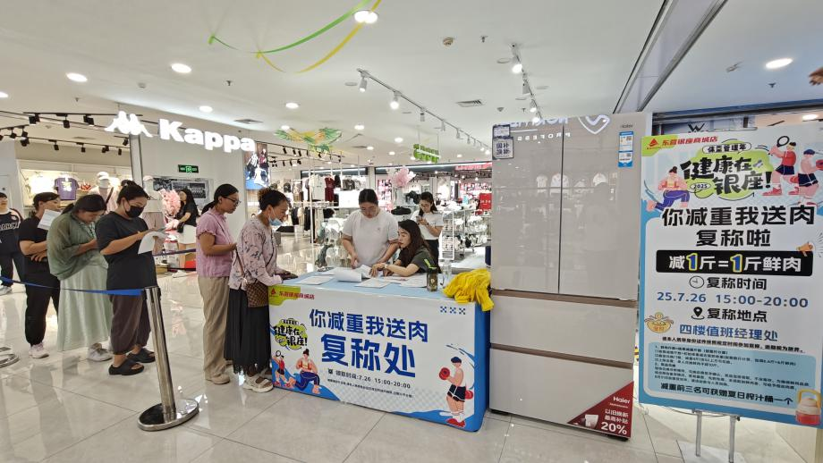 東營(yíng)區(qū)域組織11家門(mén)店開(kāi)展減重送肉活動(dòng),市民報(bào)名即可領(lǐng)取百貨超市代金券。兩期活動(dòng)累計(jì)報(bào)名1311人,復(fù)稱(chēng)679人,贈(zèng)送鮮肉4724斤。活動(dòng)與周邊社區(qū)緊密合作,在社區(qū)設(shè)置稱(chēng)重點(diǎn)方便居民參與,聯(lián)合街道衛(wèi)生院設(shè)立“健康服務(wù)站”,提供中醫(yī)把脈和“三減”知識(shí)科普。活動(dòng)同期開(kāi)展瑜伽大會(huì),讓參與者在舒緩音樂(lè)中放松身心。