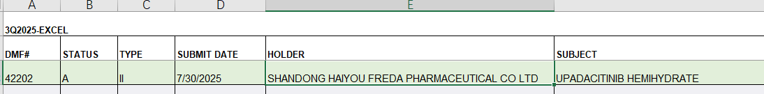 近日,海佑福瑞達自主研發的烏帕替尼半水合物(Upadacitinib Hemihydrate)的藥品主文件(DMF)已在FDA平臺公示,標志著該原料藥已做好供應美國市場的準備,為公司進軍全球高端醫藥市場奠定了堅實基礎。